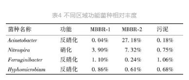 图2中MBBR-1和MBBR-2为生化池不同区域的悬浮载体,污泥为生化池活性污泥。各部分的主要菌种及相对丰度如表4所示。